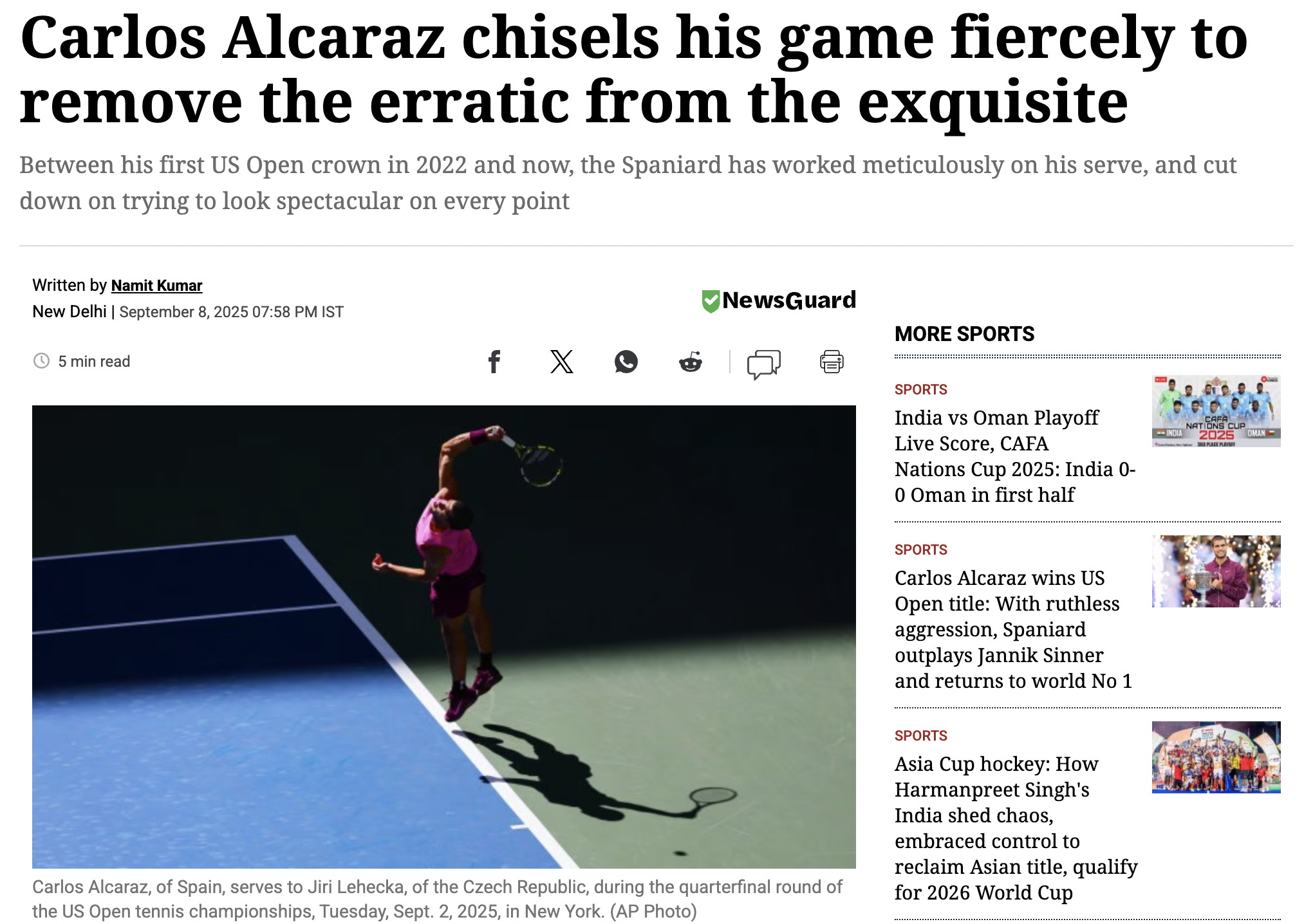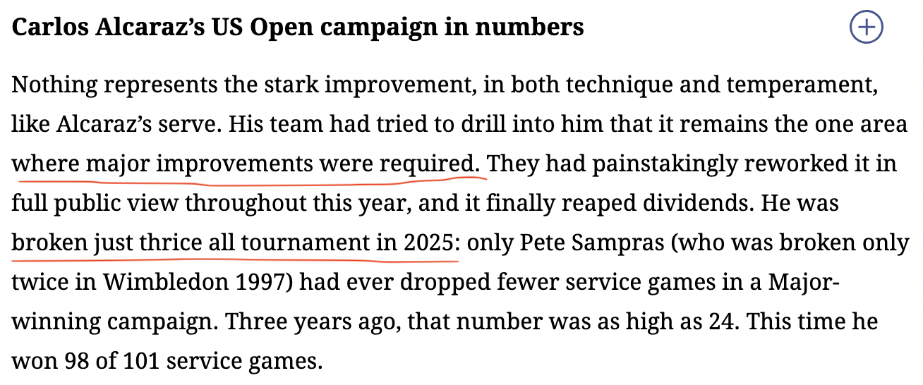A viewer can move through these three resources and understand the full picture of the current state of Carlos Alcaraz's serve. Starting with the ATP leaderboard, they'll notice his first-serve percentage stands out more than it did in previous years according to other pages on the site. With recent articles like this one from Indian Express, they can learn about what's been reported- his team has specifically targeted the serve for improvement over the past couple of seasons and a specific stat shows it's been paying off. Last up is Tennis Abstract, where a viewer can see the trend of an increasing on-average unreturned serve percentage. This means Alcaraz is gradually earning more free points from his serve than he used to. From these resources a viewer could paint the picture of how a player (in this case Alcaraz) has evolved their serve from point A to point B over time. For a coach or analyst, this could help them develop strategy for players. A sports bettor on the other hand could deem a server a safe pick for certain bets based on the analysis. Overall, this insight can be useful to a wide range of audiences, and it can be found through this variety of resources expressing the original data in different ways.