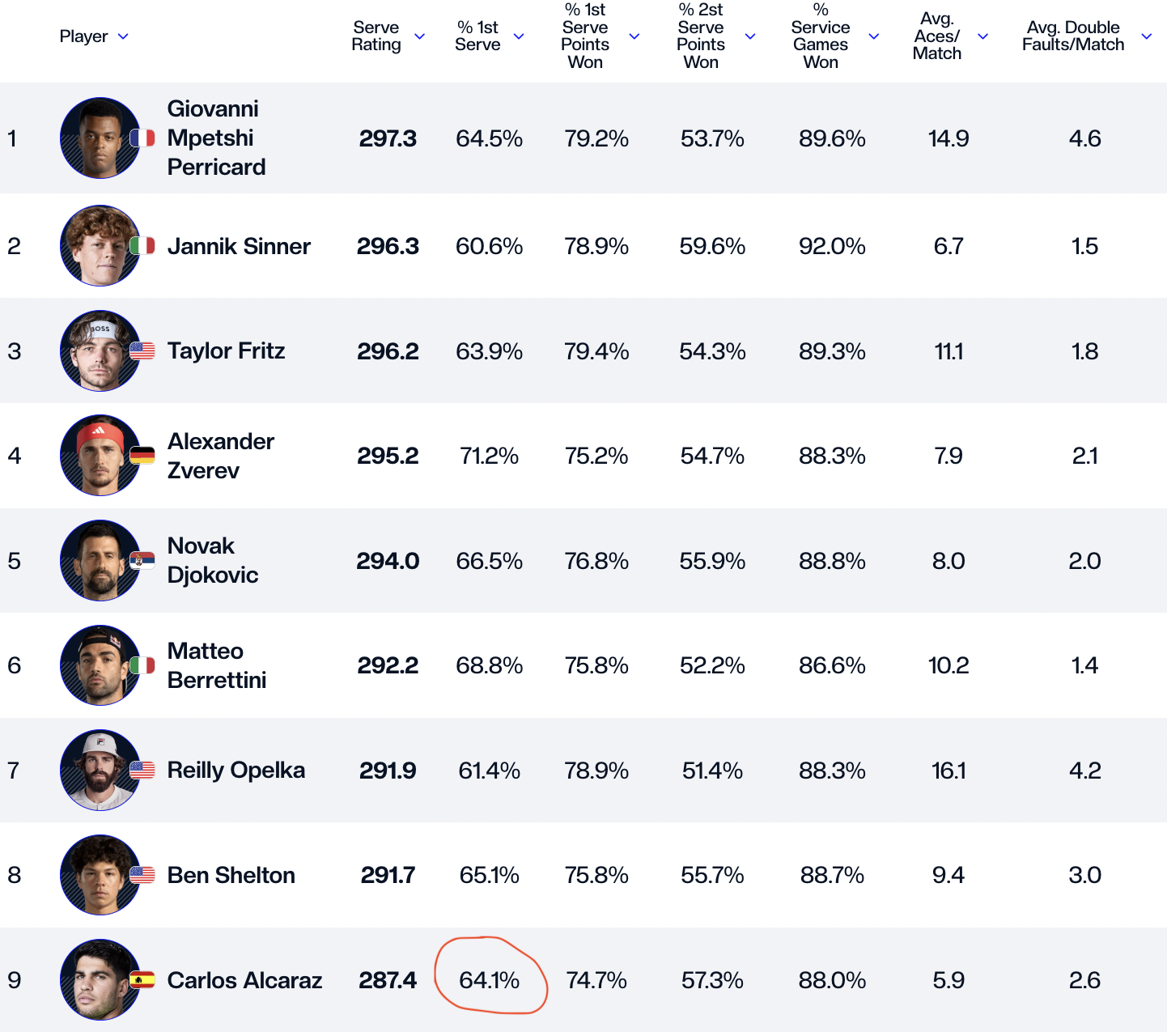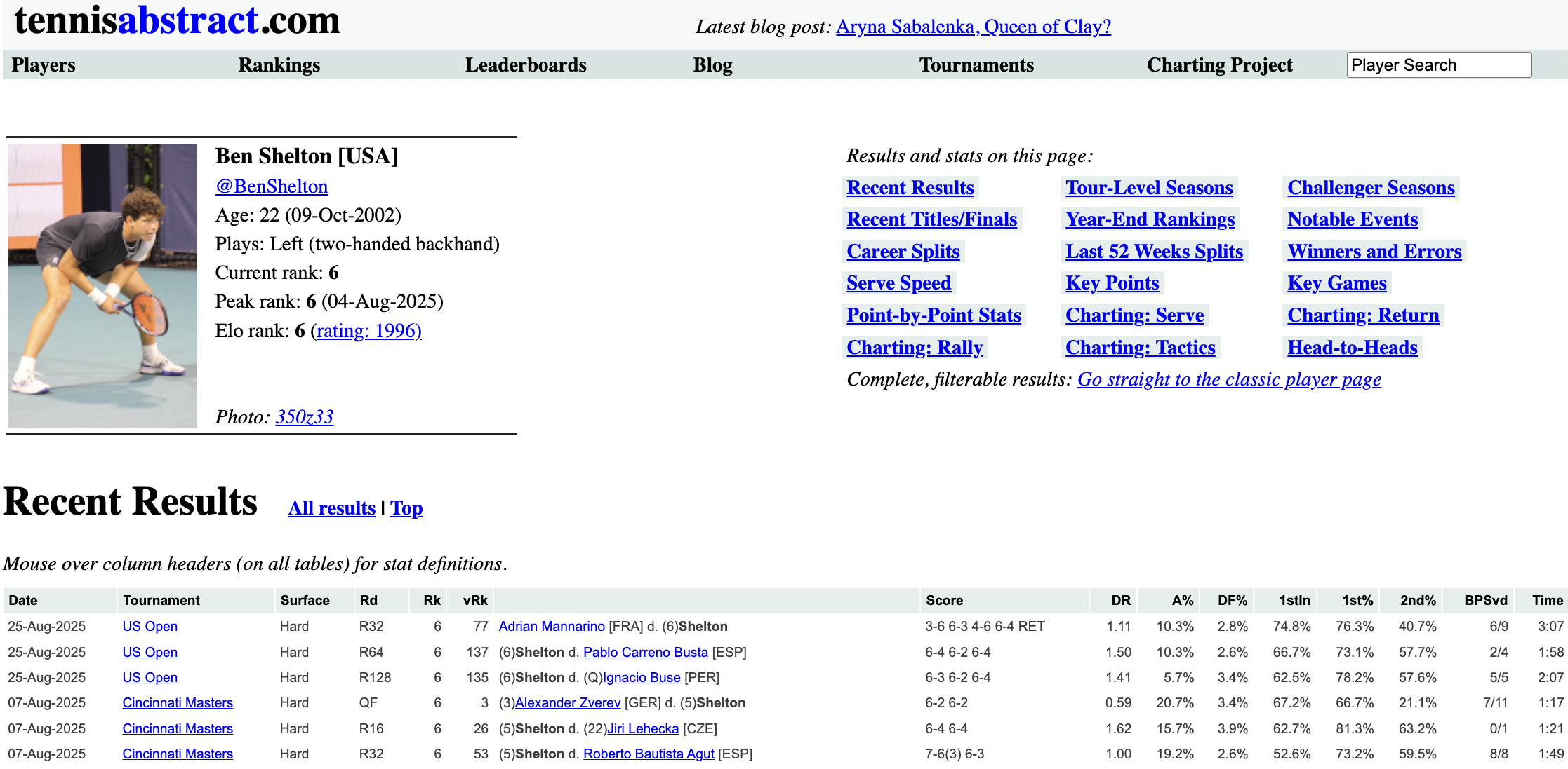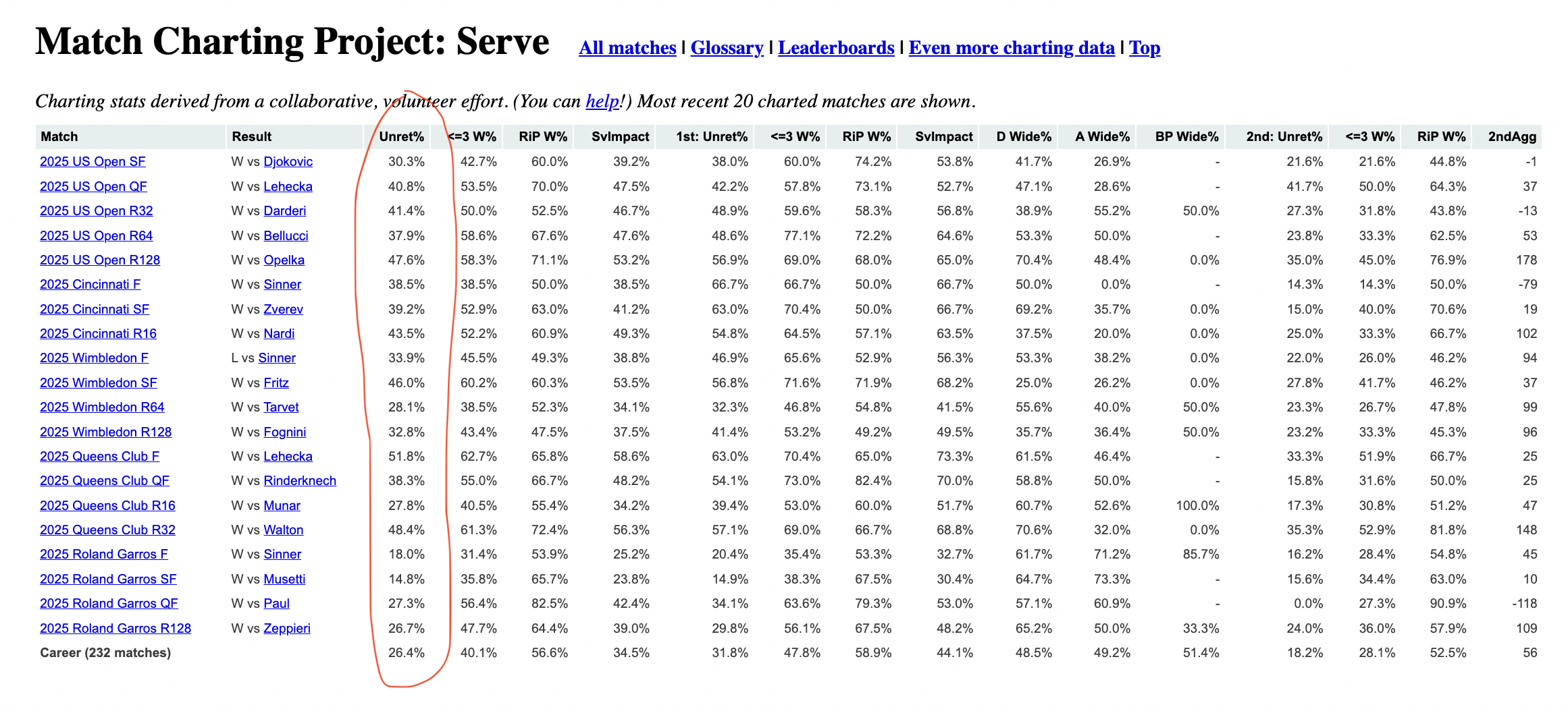 Raw stats can be found on sites like Tennis Abstract, which provide detailed statistics on players' serving performance in recent matches. These stats are a lot more extensive than the visualizations / leaderboards found on popular tennis media channels and sites. With this resource, viewers can do their own deep dive analysis to form their own conclusions and insights alongside the knowledge of what the articles and leaderboards are saying.